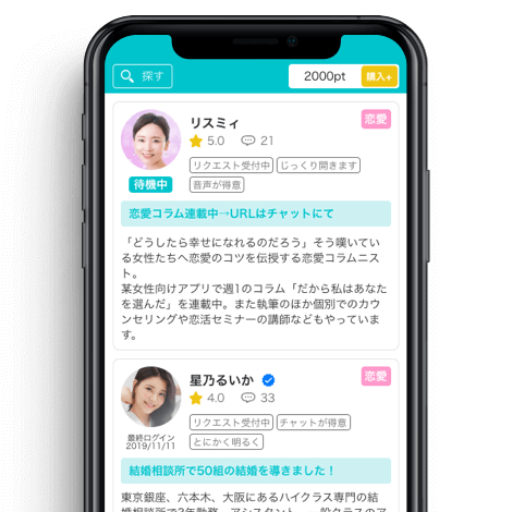恋愛の深い悩みをじっくり聞いてほしい人にはハマりやすいタイプのアプリ。