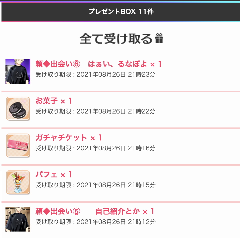 会話を進めていくと、「プレゼントBOX」に画像・アイテム・ボイスなどの報酬が届きます。