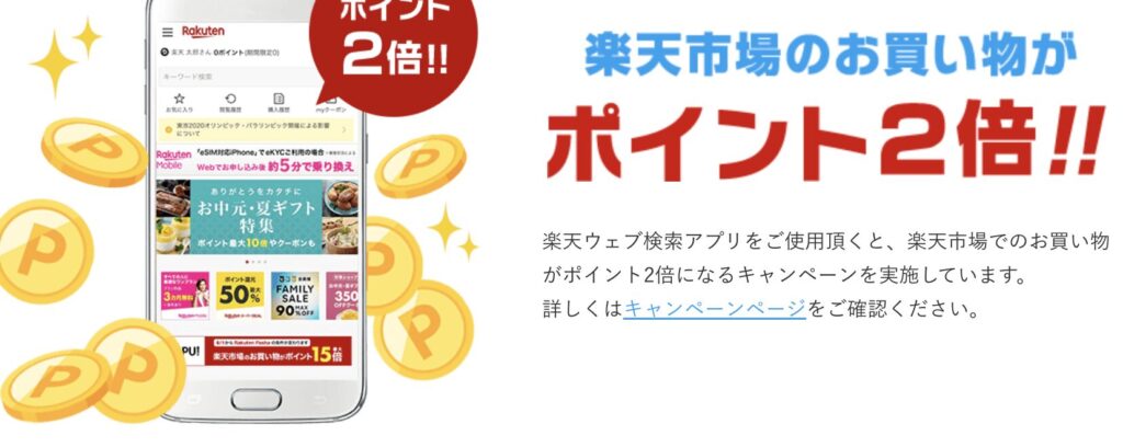 • 「お買い物2倍」などのキャンペーンは条件(検索○回、期間中利用など)があるので、条件を満たす必要がある。