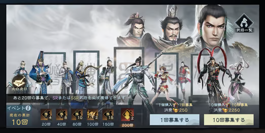 時間が少しかかるのがイヤじゃなければ、数回まわして狙いの武将を引くのもありだよ。